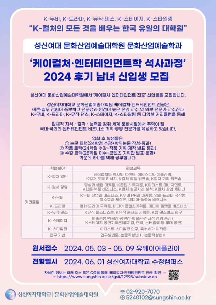 [스포츠서울 | 김태형 기자] 성신여자대학교 문화산업예술대학원 ‘케이컬처·엔터테인먼트학 석사학위 과정’에서 2024년 가을학기 남녀 신입생을 모집한다.