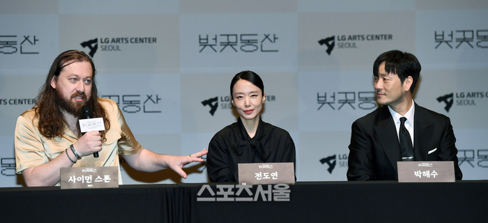 연출가 사이먼 스톤(왼쪽)과 배우 전도연(가운데), 박해수가 23일 서울 강서구 LG아트센터에서 진행된 연극 ‘벚꽃동산’ 제작발표회에서 사회자의 질문에 답을 하고 있다. ‘벚꽃동산’은 안톤 체호프의 유작으로 2024년 한국 사회를 배경으로 재해석해 배우 전도연, 박해수 손상규 등이 출연하며 세계적인 연출가 사이먼 스톤이 각색과 연출을 맡았다. 2024. 4. 23. 박진업 기자 upandup@sportsseoul.com