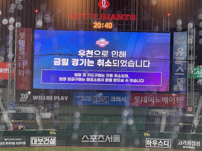 1시간 가량 지켜봤으나 비가 그치지 않았다. 오후 8시40분 경기 취소가 선언됐다. 경기가 6회 진입했을 경우 강우 콜드게임 선언으로 롯데가 이길 수도 있었다.