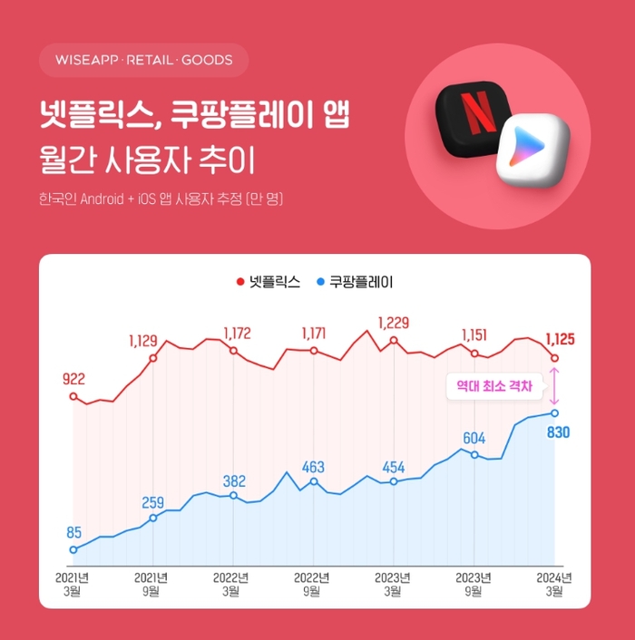 이러한 성장세에 힘입어, 쿠팡플레이는 지난달 넷플릭스와 앱 사용자 수 차이를 295만명으로 좁혔다. 이는 2020년10월 쿠팡플레이가 출시된 이후 역대 최소치다.