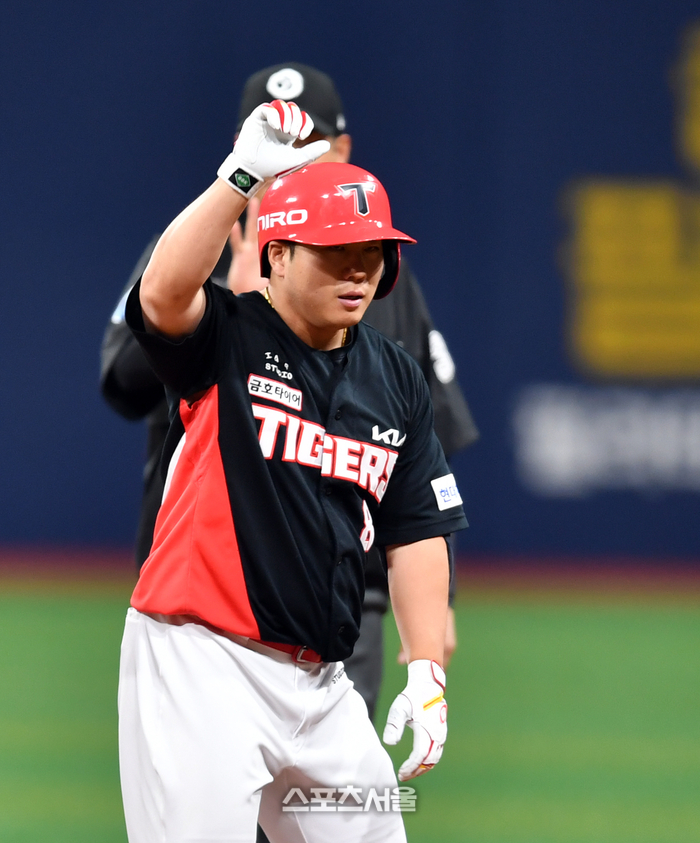 KIA 2번타자 이창진이 24일 고척스카이돔에서 열린 2024프로야구 키움히어로즈와 KIA타이거즈의 경기 1회초 1사 후 2루타로 출루하고 있다. 2024.04.24.