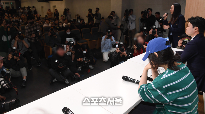 경영권 탈취 시도 의혹을 받고 있는 민희진 어도어 대표가 25일 오후 서울 서초구 한국컨퍼런스센터에서 기자회견을 시작하기 전 플래시와 셔터 세례에 마이크를 내려놓고 입을 닫고 있다. 2024. 4. 25. 박진업 기자 upandup@sportsseoul.com