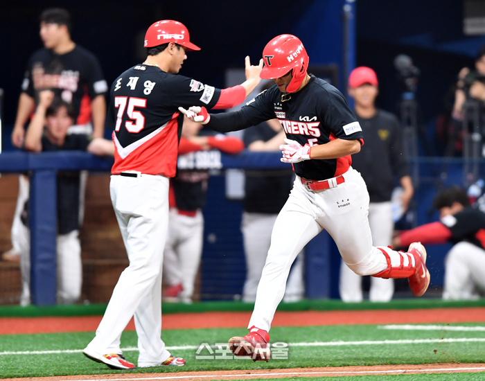 KIA 3번타자 김도영이 25일 고척스카이돔에서 열린 2024프로야구 키움히어로즈와 KIA타이거즈의 경기 5회초 선두타자로 나와 키움 김선기를 상대로 130m짜리 중월1점홈런을 터트린 후 홈인하고 있다. 2024.04.25. 고척 | 강영조기자 kanjo@sportsseoul.com