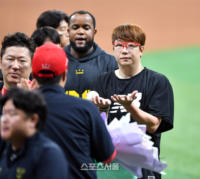 KBO두번째 170승을 달성한 양현종이 25일 고척스카이돔에서 열린 2024프로야구 키움히어로즈와 KIA타이거즈의 경기를 마친후 이범호 감독의 꽃다발 선물을 받고 미소짓고 있다. 2024.04.25. 고척 | 강영조기자 kanjo@sportsseoul.com