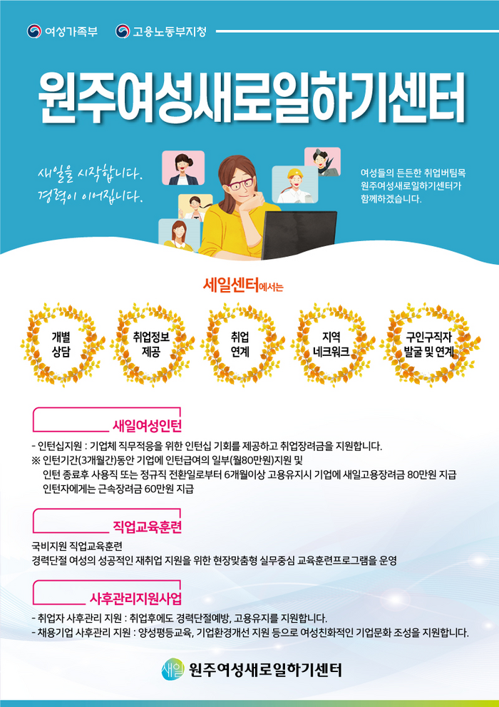 자세한 사항은 원주여성새로일하기센터(☎033-748-3131)로 문의하면 된다.