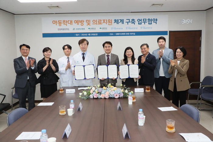 [스포츠서울ㅣ김기원기자] 강원특별자치도는 26일(금) 강릉아산병원 본관에서 강릉아산병원(이하 ‘병원’), 강원아동보호전문기관협회와 함께 아동학대 예방 및 의료지원 체계 구축을 위한 업무 협약식 및 현판 제막식을 개최한 가운데, 김진태 강원특별자치도지사를 비롯하여 유창식 강릉아산병원장, 고주애 강원아동보호전문기관협회장 등 10여명이 참석했다.