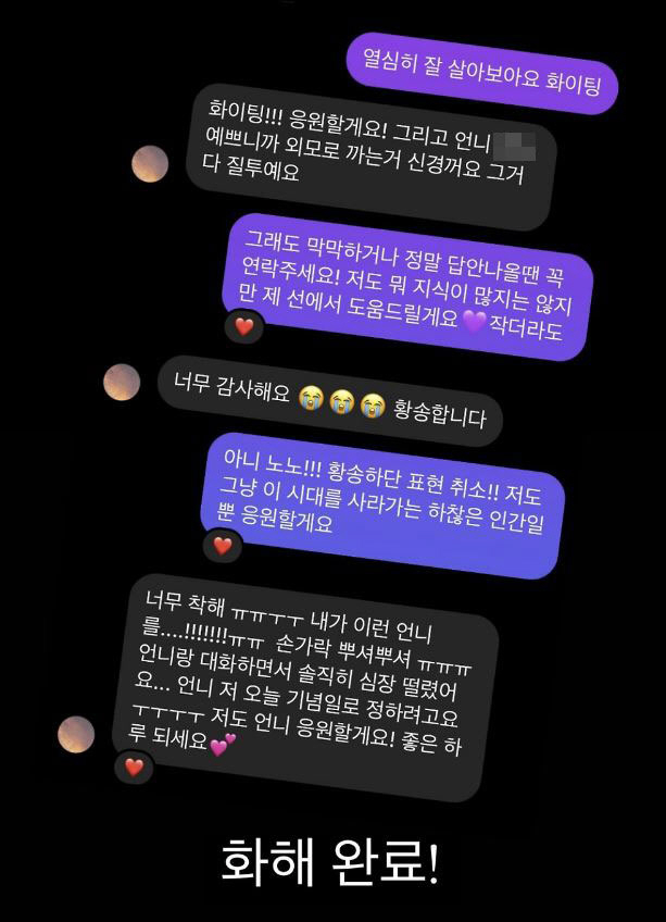 또 다시 네티즌은 “너무 착해. 내가 이런 언니를. 손가락 뿌셔뿌셔. 언니랑 대화하면서 솔직히 심장 떨렸다. 저도 언니 응원할게요”라며 대화를 마무리했다.