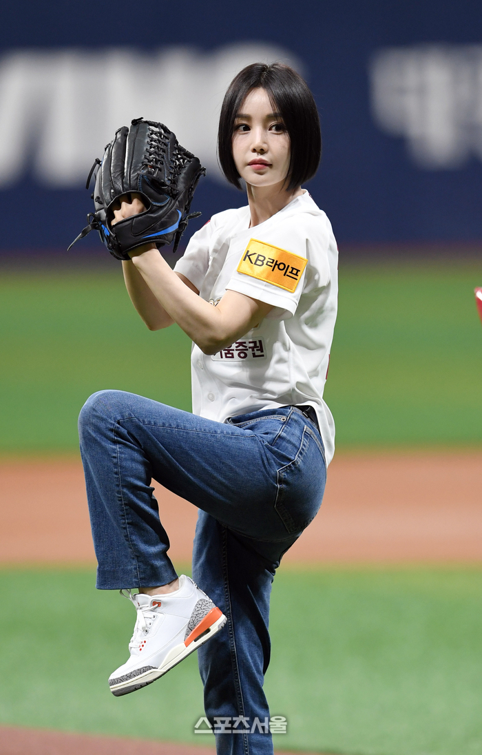 배우 겸 가수 남규리가 28일 고척스카이돔에서 열린 2024 KBO리그 키움 히어로즈와 삼성 라이온즈의 경기에 앞서 시구를 하고 있다. 2024. 4. 28. 고척 | 박진업 기자 upandup@sportsseoul.com