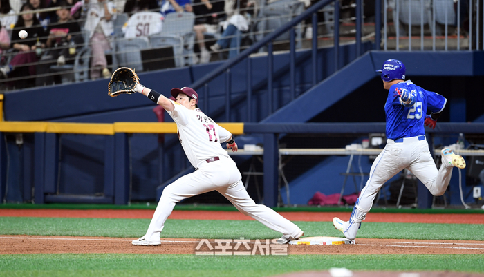 삼성 라이온즈 이병헌이 28일 고척스카이돔에서 열린 2024 KBO리그 키움 히어로즈와 경기 2회초 2사 키움 선발 하영민을 상대로 내야안타를 친 뒤 1루수 이원석의 포구에 앞서 베이스를 밟고 있다. 2024. 4. 28. 고척 | 박진업 기자 upandup@sportsseoul.com