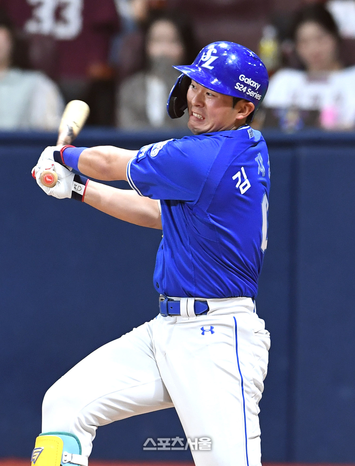 삼성 라이온즈 김재상이 28일 고척스카이돔에서 열린 2024 KBO리그 키움 히어로즈와 경기 4회초 1사 2-3루 상황에서 키움 선발 하영민을 상대로 2타점 적시타를 치고 있다. 2024. 4. 28. 고척 | 박진업 기자 upandup@sportsseoul.com