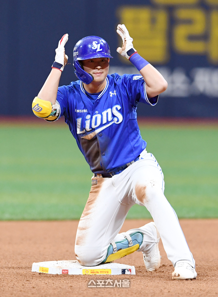 삼성 라이온즈 김재상이 28일 고척스카이돔에서 열린 2024 KBO리그 키움 히어로즈와 경기 4회초 1사 2-3루 상황에서 키움 선발 하영민을 상대로 2타점 적시타를 치고 세리머니를 하고 있다. 2024. 4. 28. 고척 | 박진업 기자 upandup@sportsseoul.com