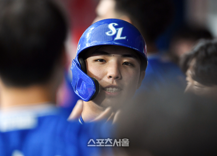 삼성 라이온즈 김영웅이 28일 고척스카이돔에서 열린 2024 KBO리그 키움 히어로즈와 경기 5회초 1사 1-3루 상황에서 김재상의 적시타에 3루에서 홈으로 뛰어 득점한 뒤 동료들과 하이파이브를 하고 있다. 2024. 4. 28. 고척 | 박진업 기자 upandup@sportsseoul.com