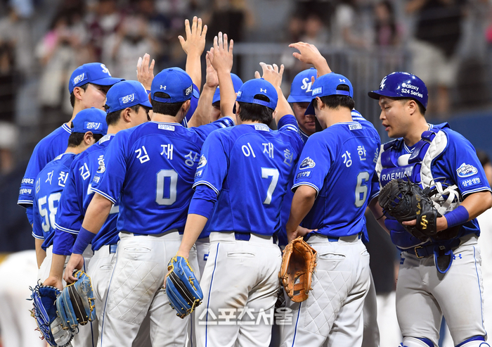 삼성 라이온즈 선수들이 28일 고척스카이돔에서 열린 2024 KBO리그 키움 히어로즈와 경기에서 승리하며 10년 만에 히어로즈를 상대로 스윕에 성공한 뒤 하이파이브를 나누고 있다. 2024. 4. 28. 고척 | 박진업 기자 upandup@sportsseoul.com