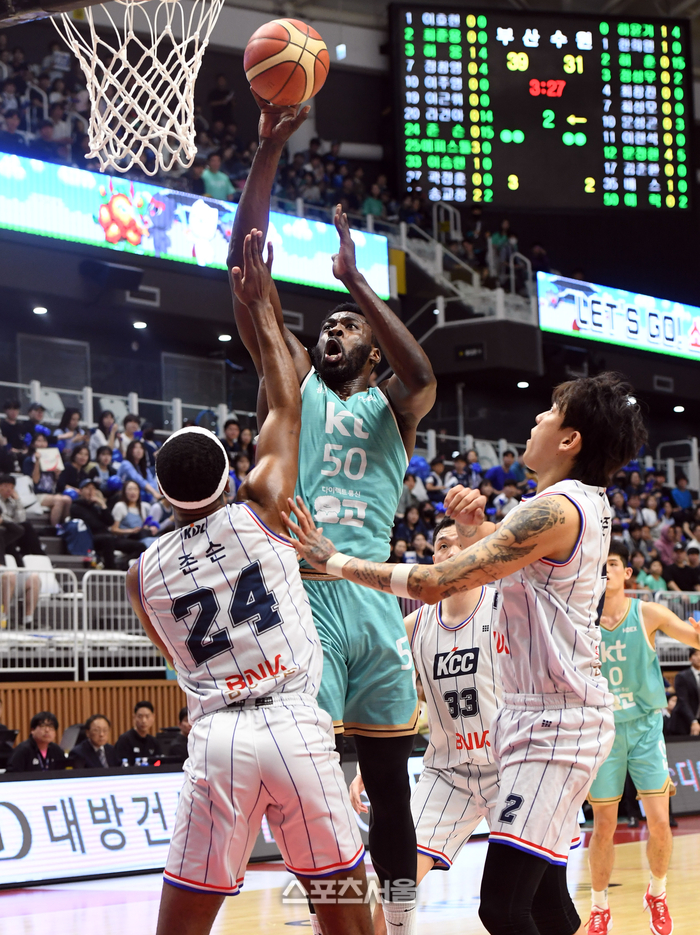 KT 마이클 에릭(가운데)이 29일 수원 KT소닉붐아레나에서 열린 2023-2024 프로농구 KCC와 챔피언결정전 2차전에서 골밑슛을 하고 있다. 2024. 4. 29. 수원 | 박진업 기자 upandup@sportsseoul.com