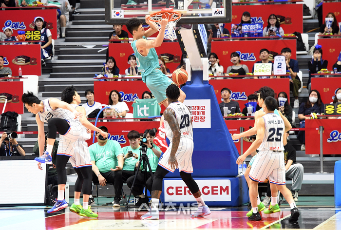 KT 하윤기가 29일 수원 KT소닉붐아레나에서 열린 2023-2024 프로농구 KCC와 챔피언결정전 2차전에서 4쿼터 막판 결정적인 덩크를 하고 있다. 2024. 4. 29. 수원 | 박진업 기자 upandup@sportsseoul.com