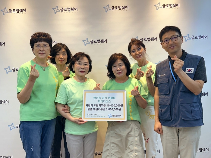 국제구호개발NGO 글로벌쉐어는 30일, 가수 황영웅 공식 팬클럽 ‘파라다이스’ 서울남부지역이 저소득 노인 가정을 위해 성금 1300만 원을 기탁했다고 밝혔다.