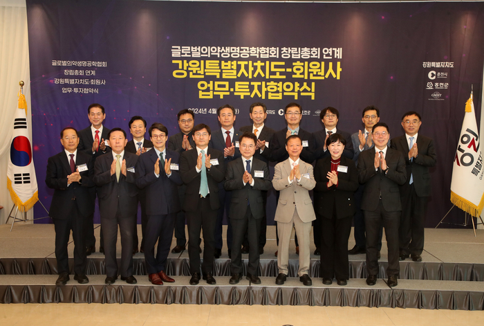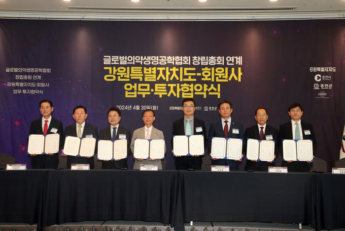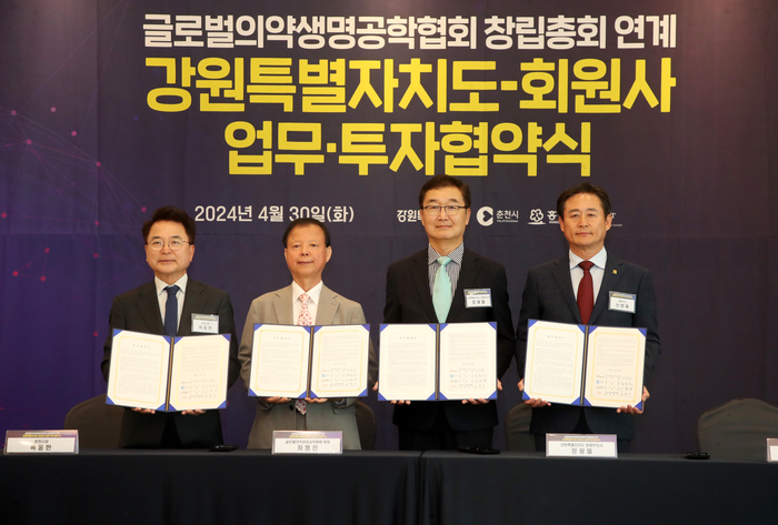 [스포츠서울ㅣ춘천=김기원기자] 강원특별자치도는 4월 30일(화) 춘천시, 홍천군, 글로벌 의약생명공학협회와 함께 업무 및 투자협약식을 개최하고, 4개 바이오기업과 총 1,600억 원의 투자협약을 체결했다.