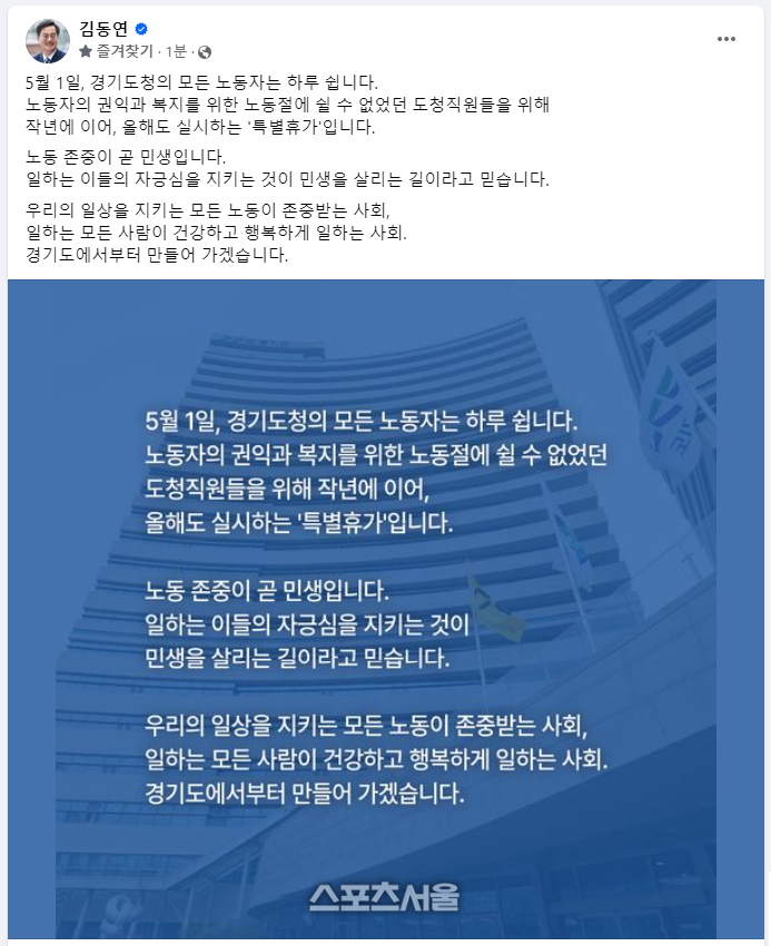 〔스포츠서울│수원=좌승훈기자〕김동연 경기도지사는 30일 자신의 SNS를 통해 “5월 1일은 경기도청의 모든 노동자가 하루 쉰다”고 전했다.