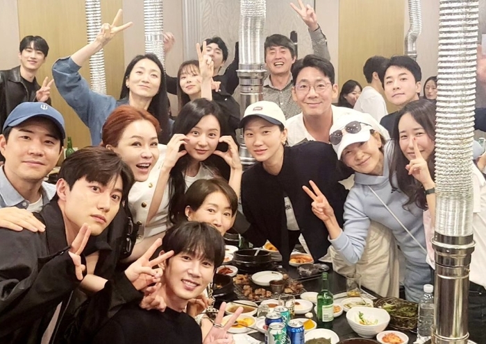 퀸즈가와 용두리 식구들까지 모든 배우들이 카메라에 잡힌 단체 사진에는 박지은 작가도 미소 지으며 V를 그리고 있는 모습.