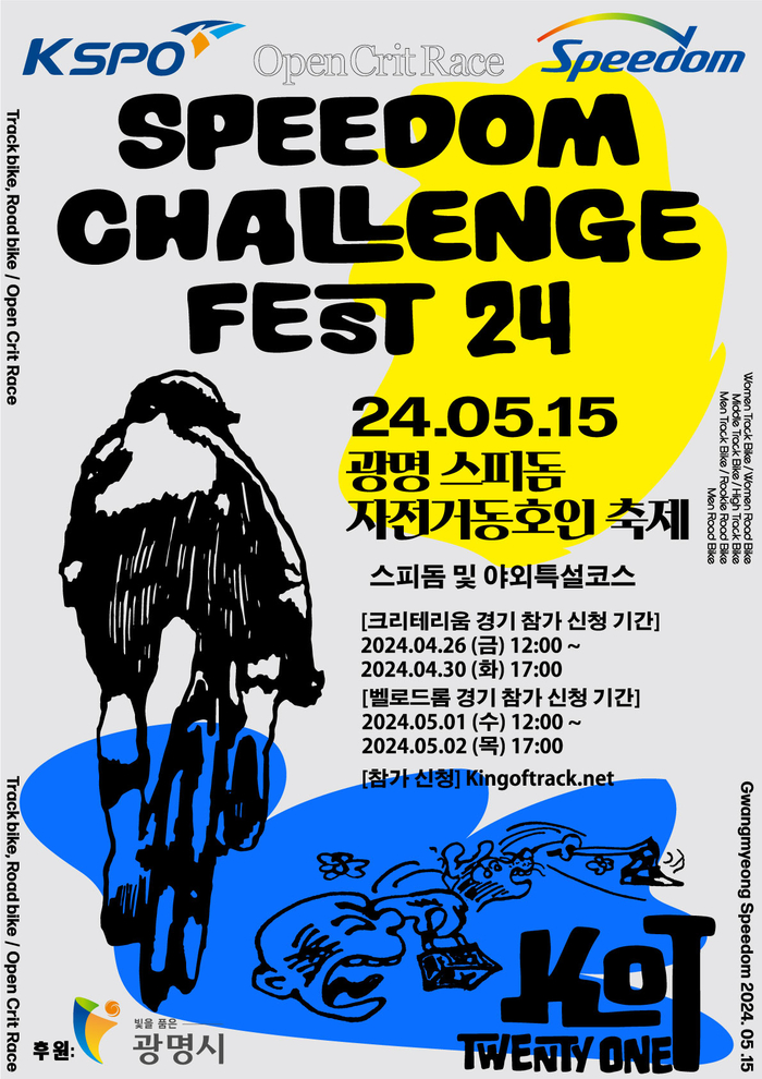 국내 유명 동호인 트랙 및 도로 자전거대회인 ‘King of Track’을 개최하는 로잉이 주최하고, 경륜경정총괄본부가 협찬·후원으로 개최 예정인 이번 ‘스피돔 챌린지 페스트 24 동호인 자전거대회’는 지난해보다 더욱 다양한 종목으로 구성되었다.