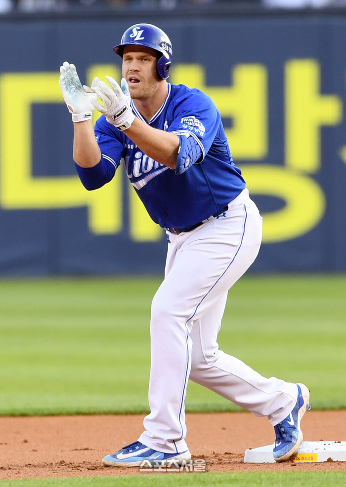 삼성 라이온즈 맥키넌이 1일 잠실구장에서 열린 2024 KBO리그 두산 베어스와 경기 1회초 2사 2루 상황에서 두산 선발 브랜든을 상대로 1타점 2루타를 친 뒤 기뻐하고 있다. 2024. 5. 1. 잠실 | 박진업 기자 upandup@sportsseoul.com