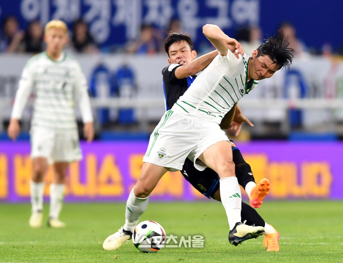 인천 박승호가 1일 인천축구전용구장에서 열린 2024 프로축구 인천유나이티드와 전북현대의 경기에서 전북 이준호와 치열한 볼다툼을 벌이고 있다. 2024.05.01. 인천 | 강영조기자 kanjo@sportsseoul.com