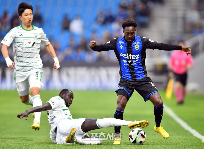 인천 제르소가 1일 인천축구전용구장에서 열린 2024 프로축구 인천유나이티드와 전북현대의 경기에서 돌파를 시도하다 전북 보아텡에 저지당하고 있다. 2024.05.01. 인천 | 강영조기자 kanjo@sportsseoul.com