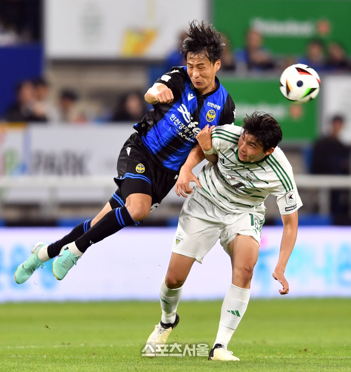 인천 권한진이 1일 인천축구전용구장에서 열린 2024 프로축구 인천유나이티드와 전북현대의 경기에서 전북 이준호와 공중볼 다툼을 벌이고 있다. 2024.05.01. 인천 | 강영조기자 kanjo@sportsseoul.com
