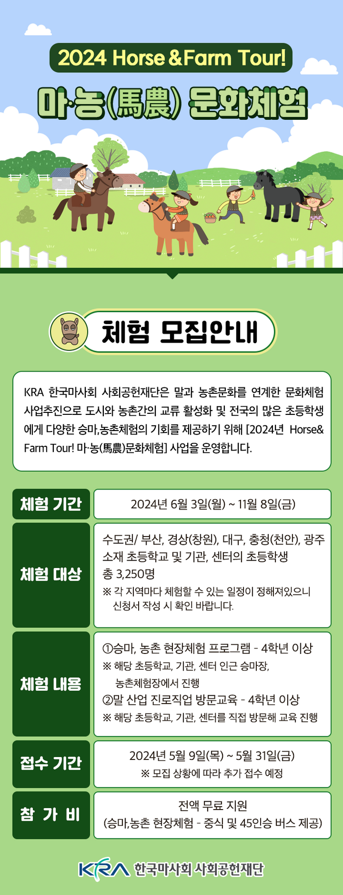 2024년도 ‘Horse & Farm Tour! 마·농(馬·農) 문화체험’은 체험비용부터 버스, 식비까지 모든 비용을 무상으로 제공한다. 참여를 희망하는 초등학교 및 기관, 단체는 9일부터 31일까지 스쿨김영사 홈페이지를 통해 신청 접수하면 된다. 행사 참여와 관련된 문의사항은 스쿨김영사를 통해 유선으로 안내받을 수 있다. iaspire@sportsseoul.com
