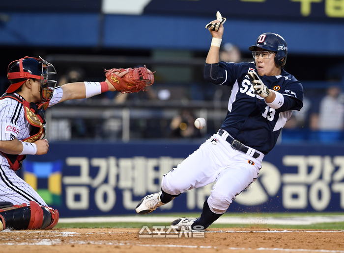 두산 베어스 허경민이 3일 잠실구장에서 열린 2024 KBO리그 LG 트윈스와 경기 3회초 1사 2-3루 상황에서 양의지의 적시타 때 2루에서 홈까지 달려 득점하고 있다. 2024. 5. 3. 잠실 | 박진업 기자 upandup@sportsseoul.com