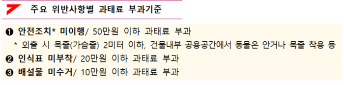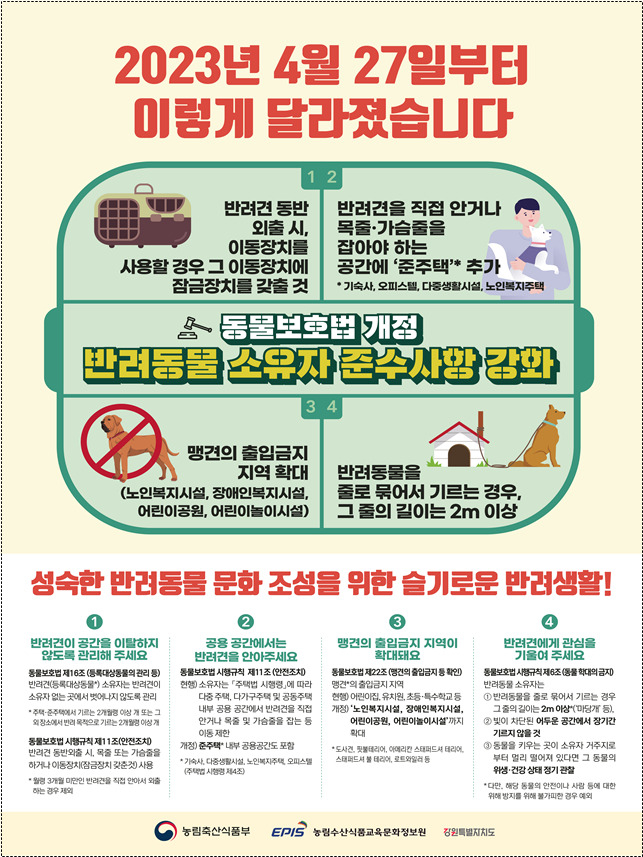 이번 홍보 및 단속 활동은 도 내 18개 시군에서 자체 단속반을 편성하여 반려견 동반 산책 활동이 많은 산책로와 공원 등을 중심으로 실시하며, 소유자 준수사항 위반 시 과태료 부과 등 행정조치가 이루어질 예정이다.