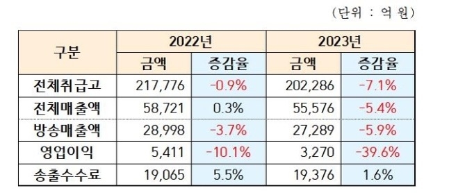 전체 매출액 대비 방송매출액 비중은 2021년까지 50%대를 유지했으나 2022년 49.4%, 지난해 49.1%로 작아졌다. 영업이익률 또한 2021년 10.3%에서 2022년 9.2%에 이어 지난해 5.9%로 낮아졌다.