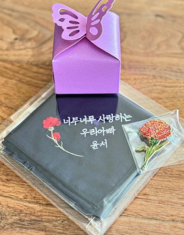 사진에는 ‘너무너무 사랑하는 우리 아빠. 윤서’라는 자수가 새겨진 손수건과 카네이션 브로치가 담겼다. 아빠 최수종을 향한 딸의 마음이 듬뿍 담겼다.