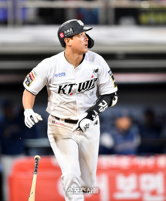 KT 7번타자 황재균이 8일 수원KT위즈파크에서 열린 2024 프로야구 KT위즈와 NC다이노스 경기 6회말 1사 1루에서 안타로 출루하고 있다. 2024.05.08. 수원 | 강영조기자 kanjo@sportsseoul.com