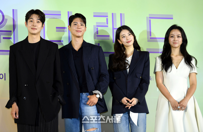 최우식, 박보검, 수지, 탕웨이(왼쪽부터)가 9일 서울 CGV 용산아이파크몰에서 열린 영화 ‘원더랜드’ 제작보고회에서 포즈를 취하고 있다. ‘원더랜드’는 죽은 사람을 인공지능으로 복원하는 영상통화 서비스 ‘원더랜드’를 통해 사랑하는 사람과 다시 만나는 이야기로 6월 5일 개봉 예정이다. 2024. 5. 9. 최승섭기자 thunder@sportsseoul.com