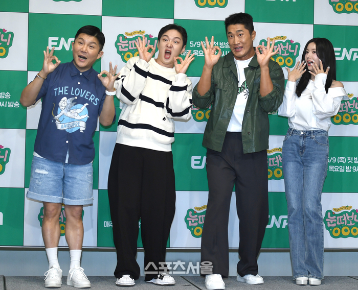 조세호, 이창섭, 김동현, 권은비(왼쪽부터)가 9일 아만티 호텔 서울에서 열린 ENA 신규 오리지널 예능 ‘눈떠보니 ㅇㅇㅇ’ 제작발표회에서 포즈를 취하고 있다. 2024. 5. 9. 최승섭기자 thunder@sportsseoul.com