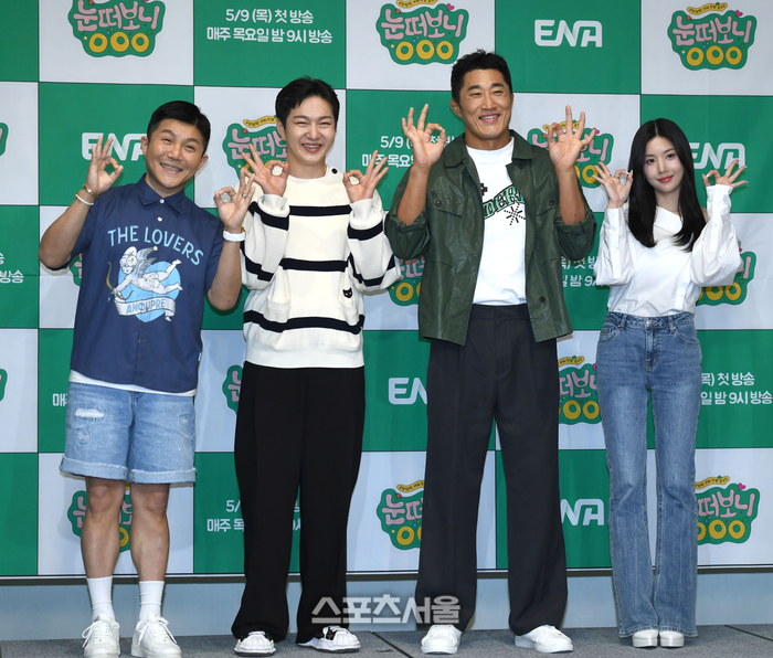조세호, 이창섭, 김동현, 권은비(왼쪽부터)가 9일 아만티 호텔 서울에서 열린 ENA 신규 오리지널 예능 ‘눈떠보니 ㅇㅇㅇ’ 제작발표회에서 포즈를 취하고 있다. 2024. 5. 9. 최승섭기자 thunder@sportsseoul.com