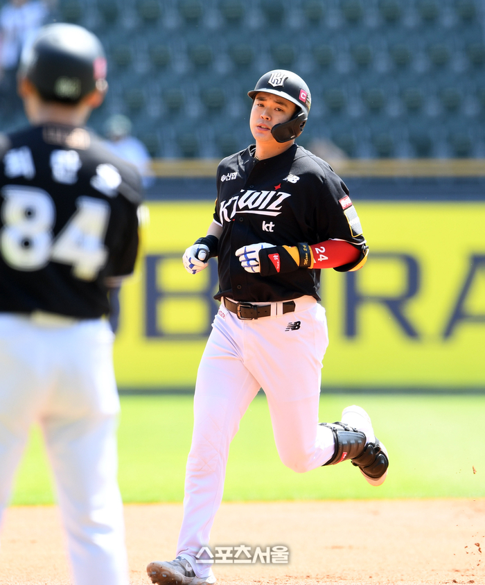 KT 위즈 문상철이 12일 잠실구장에서 열린 2024 KBO리그 두산 베어스와 경기 1회초 1사 두산 선발 최준호를 상대로 솔로 홈런을 친 뒤 베이스를 돌고 있다. 강백호에 이은 연속 타자 홈런으로 문상철의 시즌 8호 홈런. 2024. 5. 12.
