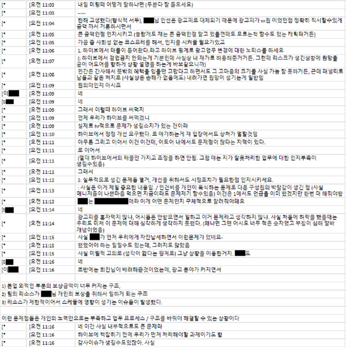 하이브도 즉각 반박했다. 하이브는 “해당 시간에 감사를 실시한 건 해당 팀장이 오후 6시에 출근했기 때문”이라며 “출근 과정에서 감사팀의 연락을 받은 당사자가 오후 7시부터 감사에 응하겠다고 답했다”고 설명했다. 또 “회사의 정직원이 광고주로부터 직접적으로 수억원 대의 이익을 취하는 관행이란 없다”고 일축했다.