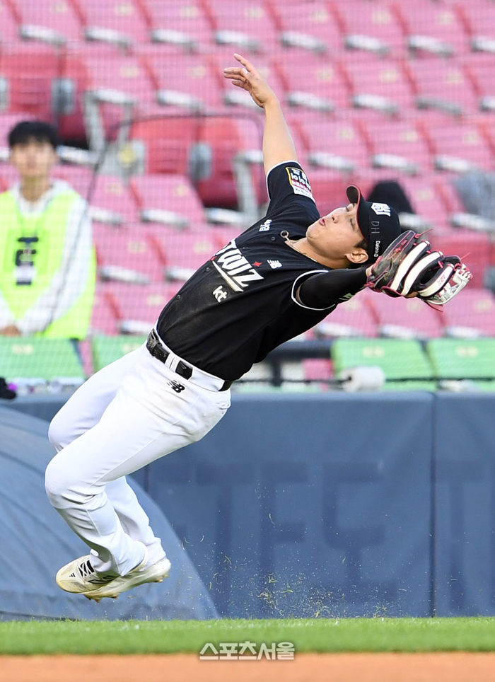 KT 위즈 3루수 황재균이 12일 잠실구장에서 열린 2024 KBO리그 두산 베어스와 더블헤더 2차전 5회말 무사 두산 라모스의 파울타구를 잡아내고 있다. 2024. 5. 12.