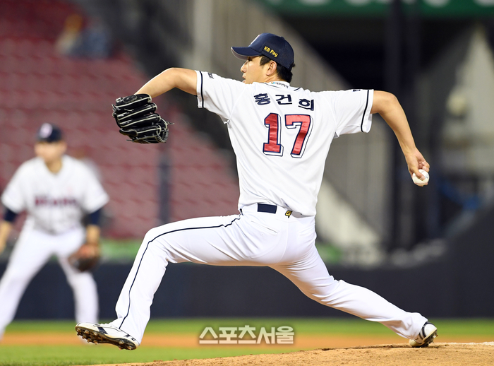 두산 베어스 홍건희가 12일 잠실구장에서 열린 2024 KBO리그 KT 위즈와 더블헤더 2차전 9회초 등판해 힘차게 공을 던지고 있다. 2024. 5. 12.
