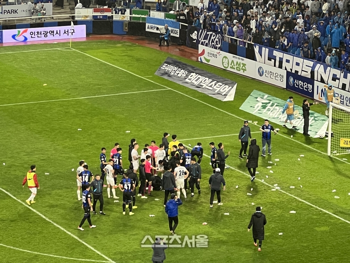 초유의 사태다. 크게 다친 선수는 없지만, 무게 실린 물병은 흉기가 되기도 한다. 또 많은 비가 내리는 상황에서도 경기장을 찾은 1만4000여명의 눈살을 찌푸리게 만들었다. 인천은 경인더비를 대비해 경호 인력을 평소보다 2배 가까이 증원해 곳곳에 인력을 배치했지만, 갑작스럽게 발생한 사고를 막지 못했다.