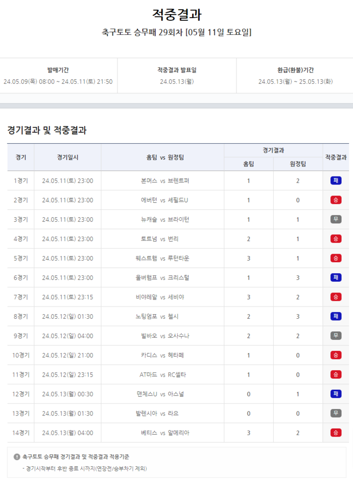 이번 승무패 29회차의 총 14개 대상 경기 결과는 승(홈팀의 승)이 7건, 패(홈팀의 패) 4건, 양 팀의 무승부는 3건이었다.