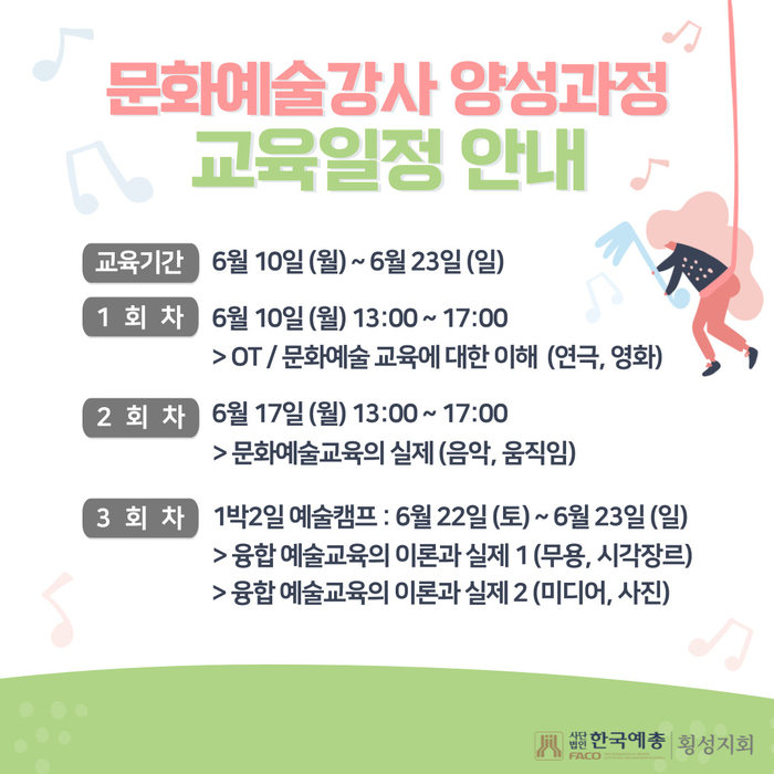 [스포츠서울ㅣ김기원기자] (사)한국예총 강원특별자치도연합회 횡성지회(지회장 정재영, 이하 횡성예총)는 횡성군 지역 예술인의 예술교육 전문성 강화를 위해 2024 횡성문화예술 강사 양성 과정을 개설한다고 밝혔다.