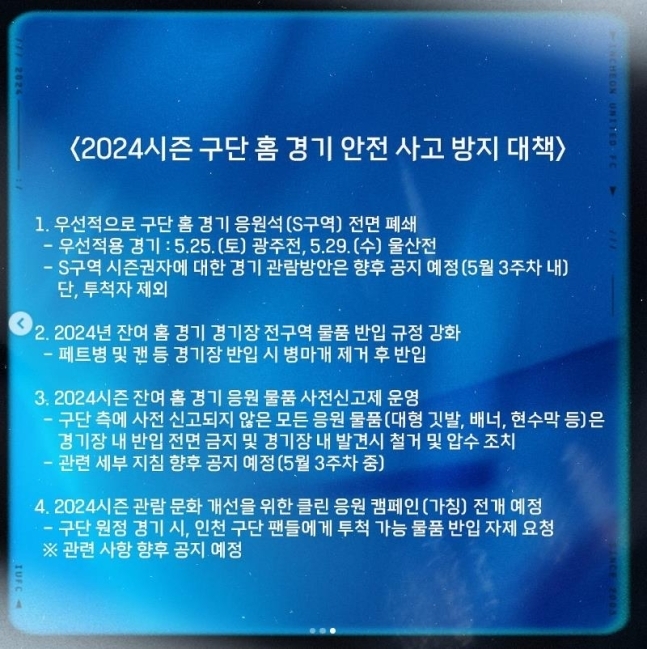 또 2024시즌 잔여 홈경기 경기장 전구역 물품 반입 규정을 강화한다. 페트병 및 캔 등 경기장 반입 시 병마개를 제거해야 하며, 홈경기 응원 물품 반입에 대한 사전 신고제를 운영한다. 구단은 ‘사전에 신고되지 않은 모든 응원 물품(대형 깃발, 배너, 현수막 등)은 경기장 내 반입 전면 금지 및 경기장 내 발견시 철거 및 압수 조치한다’면서 관련 세부 지침은 향후 공지 예정이라고 공지했다.