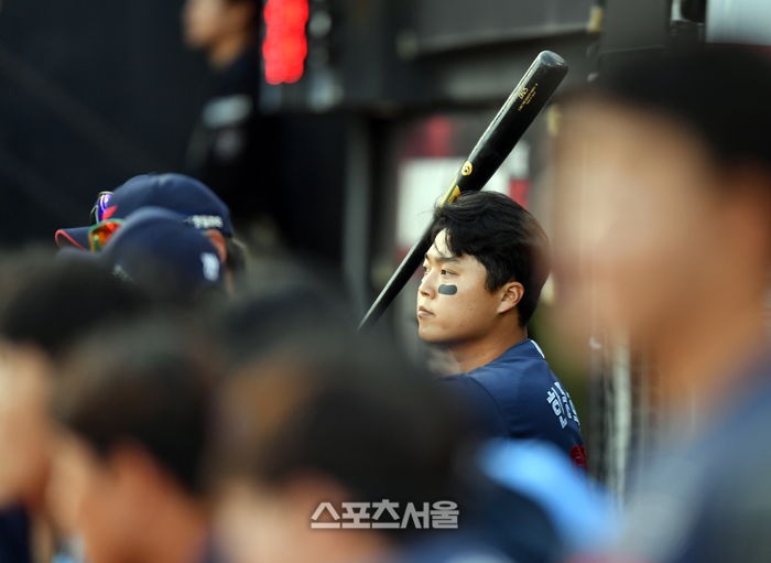 롯데 한동희가 14일 수원KT이즈파크에서 열리는 2024 프로야구 KT위즈와 롯데자이언츠 경기 초반 더그아웃에서 타석을 준비하고 있다. 2024.05.14.