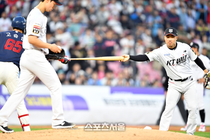 신본기가 14일 수원KT이즈파크에서 열리는 2024 프로야구 KT위즈와 롯데자이언츠 경기 4회초 고승민의 방망이를 줏어 전달하고 있다. .2024.05.14.