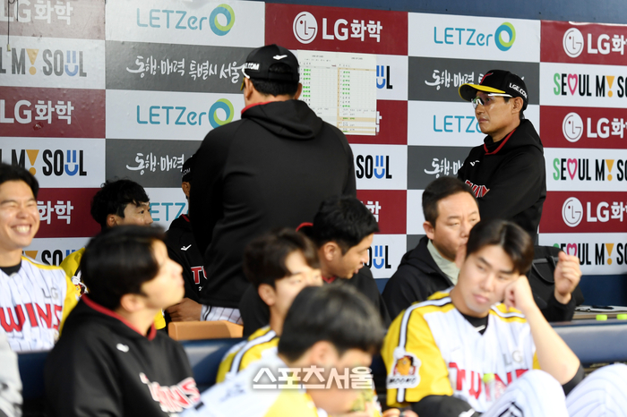 LG 염경엽 감독이 15일 잠실야구장에서 열리는 2024 KBO리그 키움과 경기 개회여부를 기다리며 코치들과 이야기를 나누고 있다.