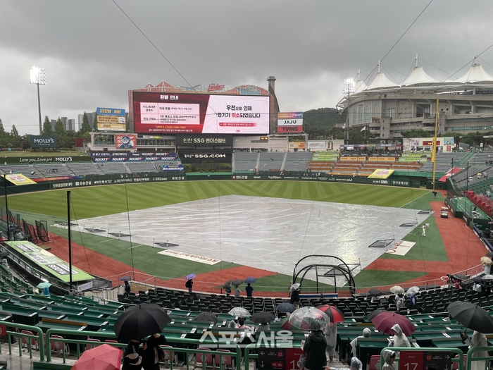 급하게 랜더스필드에 대형 방수포가 깔렸지만, 매섭게 내리는 비는 어쩔 수 없다. 밤 12시까지 비가 오는 것으로 예보도 나온 상태.