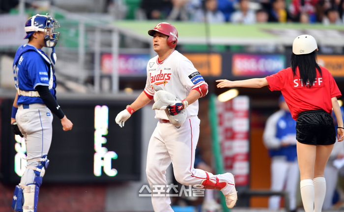 SSG 7번타자 이지영이 16일 인천SSG랜더스필드에서 열리는 2024 프로야구 SSG랜더스와 삼성라이온즈 경기 3회말 선두타자로 나와 코너를 상대로 좌중월 솔로홈런을 터트린 후 홈인하고 있다. 시즌1호포에 무관심세리머니로 응대하는 SSG 선수들. 2024.05.16.